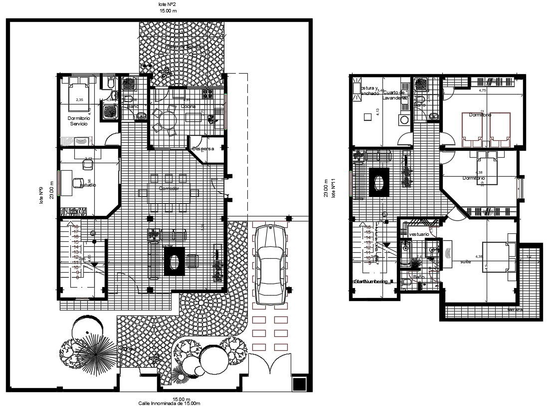 Plan of house 15.00mtr x 23.00mtr with furniture details in autocad