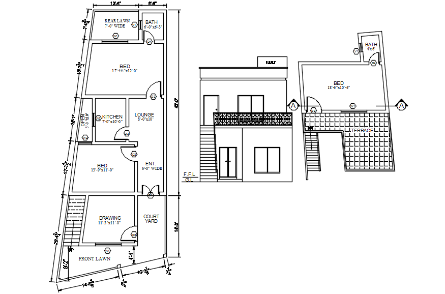Autocad drawing residential bungalow it includes furniture layout, front facade, terrace layout it also includes kitchen, drawing room,dining room,bedrooms,toilets,bathroom,parking area,etc