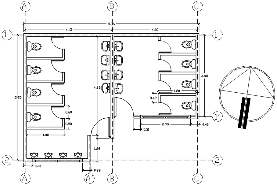 Commercial toilet layout in Autocad it include floor layout it also includes toilets,w,c, basin area, urinals,etc