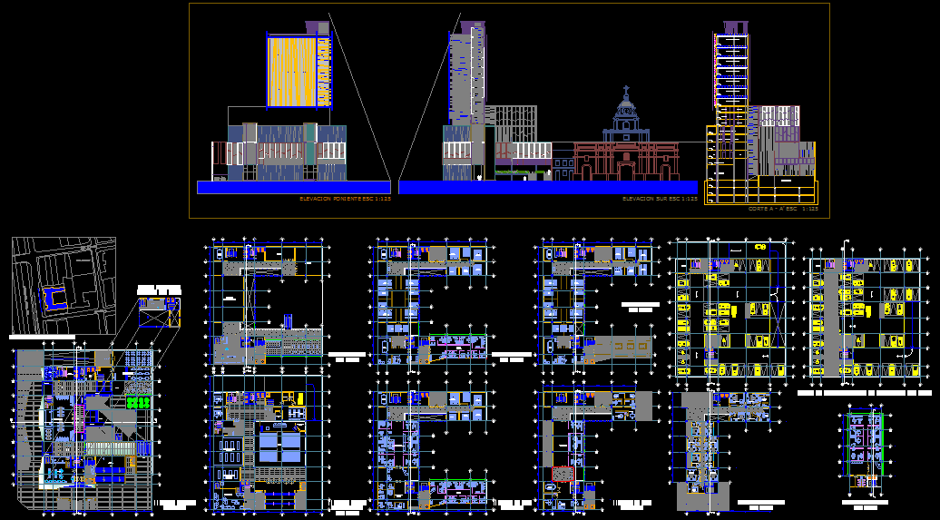Autocad Drawing files of the commercial building floor plan, section, and elevation design are given in this DWG file. The staircase is available to the inside of the Building. Elevation of this commercial building is available in this DWG file.