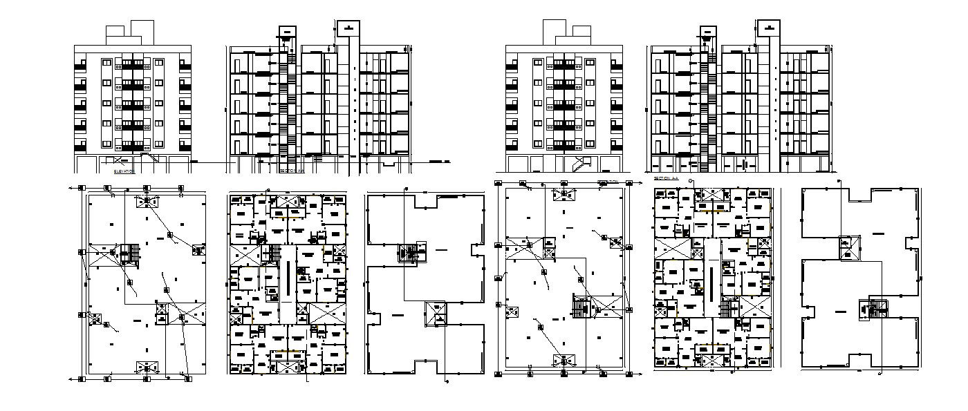Dwg file of the residential apartment it includes ground floor layout, first-floor layout, sectional elevation, front facade it also includes kitchen, drawing room, dining room, bedrooms, toilets, bathroom, parking area,etc