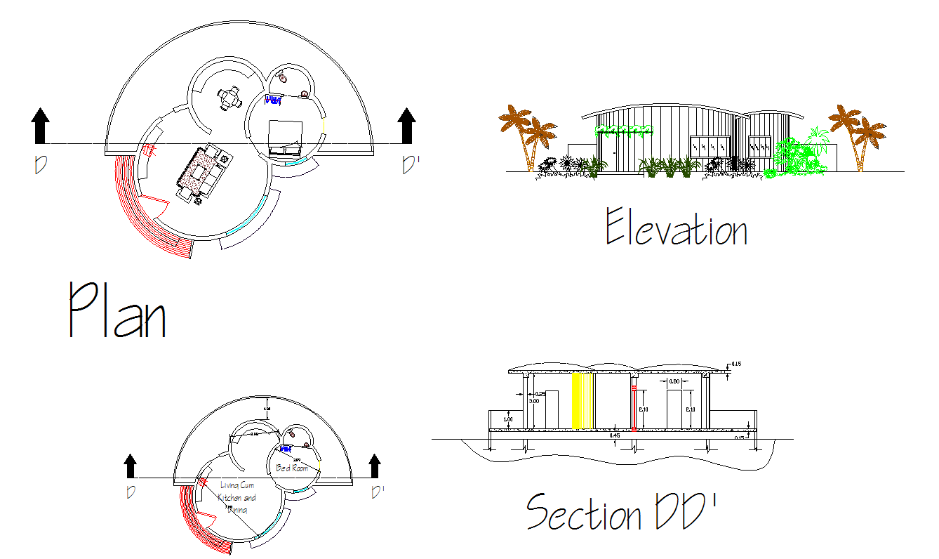 Ultra modern House Design Download file. ground floor plan, second floor plan include seating area, office, kitchen, dining area, 3 bedroom also elevation design in autocad file.
