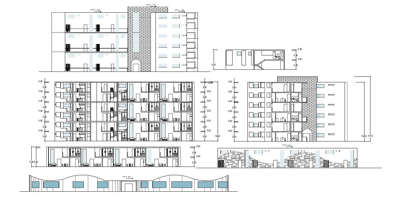 Autocad drawing of hotel elevations it includes front facade, rear elevation, side elevation, main gate elevation it also includes floor level, doors, windows, balcony,etc