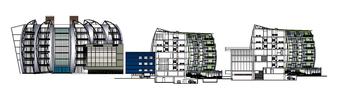 Sectional elevation of the commercial complex it includes front facade, rear elevation it also includes the main entrance, floor level, parking area,etc