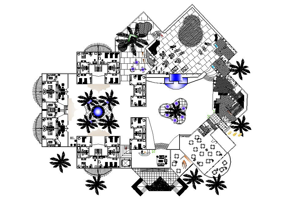 Autocad drawing of hotel layout it include floor layout, furniture layout it also includes a reception area, waiting area, bedrooms, cafe, restaurant,etc
