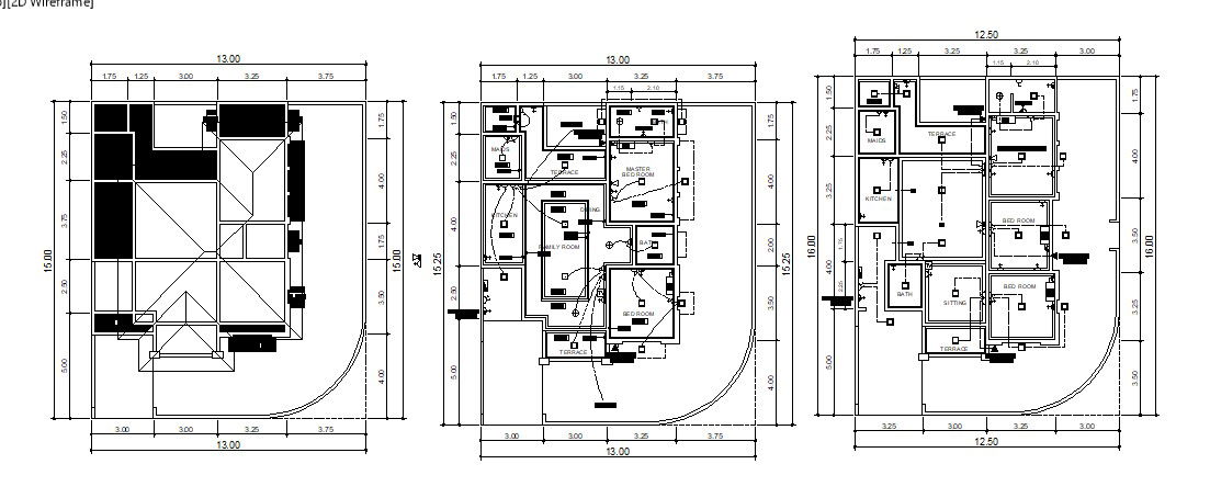 Design of house plan with detail dimension in autocad which includes detail of hall, living room, master bedroom, bedroom, kitchen, dining area, bathroom, toilet, etc it also gives detail of roof plan.