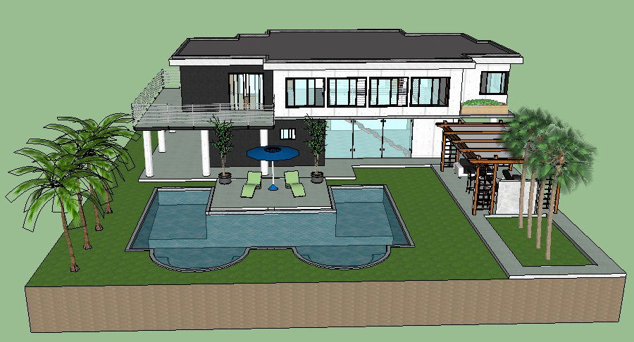 House design with the exterior in skp file it includes a pool area, balcony, door, window, garden area, etc