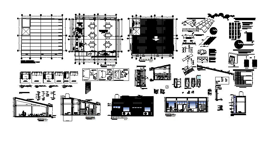 Cafeteria Elevation In DWG File it includes furniture layout, roof plan, elevations, sections, construction details, it also includes kitchen, dining, utility area, storage, toilets.