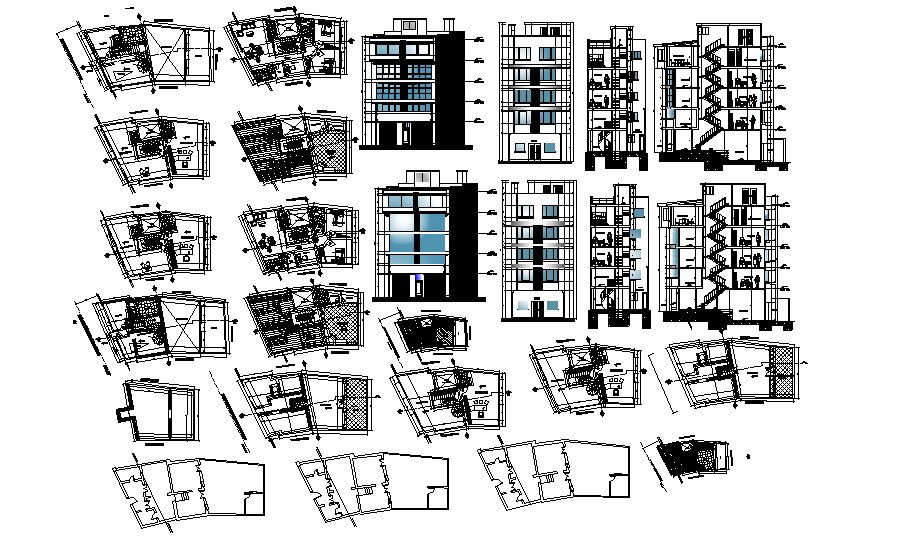Multistorey Building Plan Elevation Section In DWG File which provides detail of front elevation, back elevation, different section, detail of floor level, detail dimension of the hall, bedroom, kitchen, dining area, bathroom, toilet.