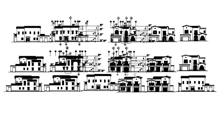 Villa Drawing In DWG File which provides detail of front elevation, rear elevation, left side elevation, right side elevation, detail of floor level, detail of door and windows.