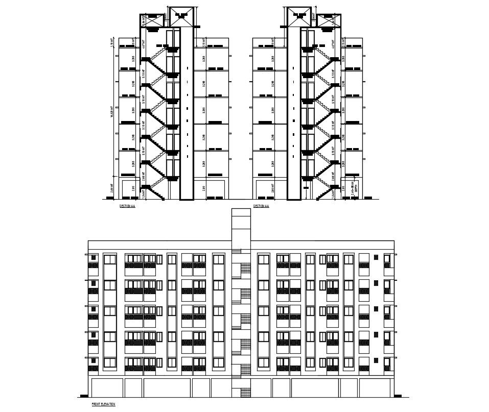 Apartment Building Plan In AutoCAD File it includes detail of front elevation, section, floor level.