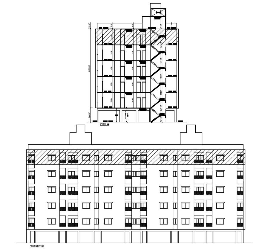 Apartment Elevation Design In DWG File which includes detail of front elevation, detail of the section, detail of floor level.