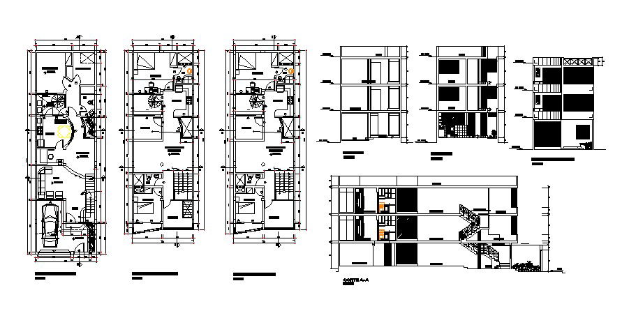Apartment Elevation Section In DWG File which provides detail of hall, bedroom, kitchen, dining room, bathroom, toilet, etc it also gives detail of furniture, floor level.