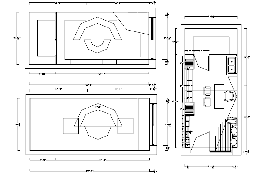 Small Cabin Plans CAD Drawings which includes detail of cabin area, washroom, toilet, etc it also gives detail of furniture.