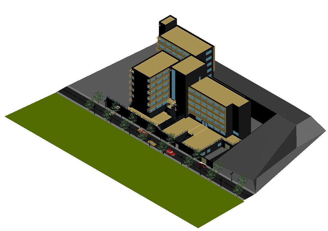 Building Design Plan In DWG File which provides detail of an isometric view of the building, detail of doors and window, detail of the garden area, detail of the outer design of the building.