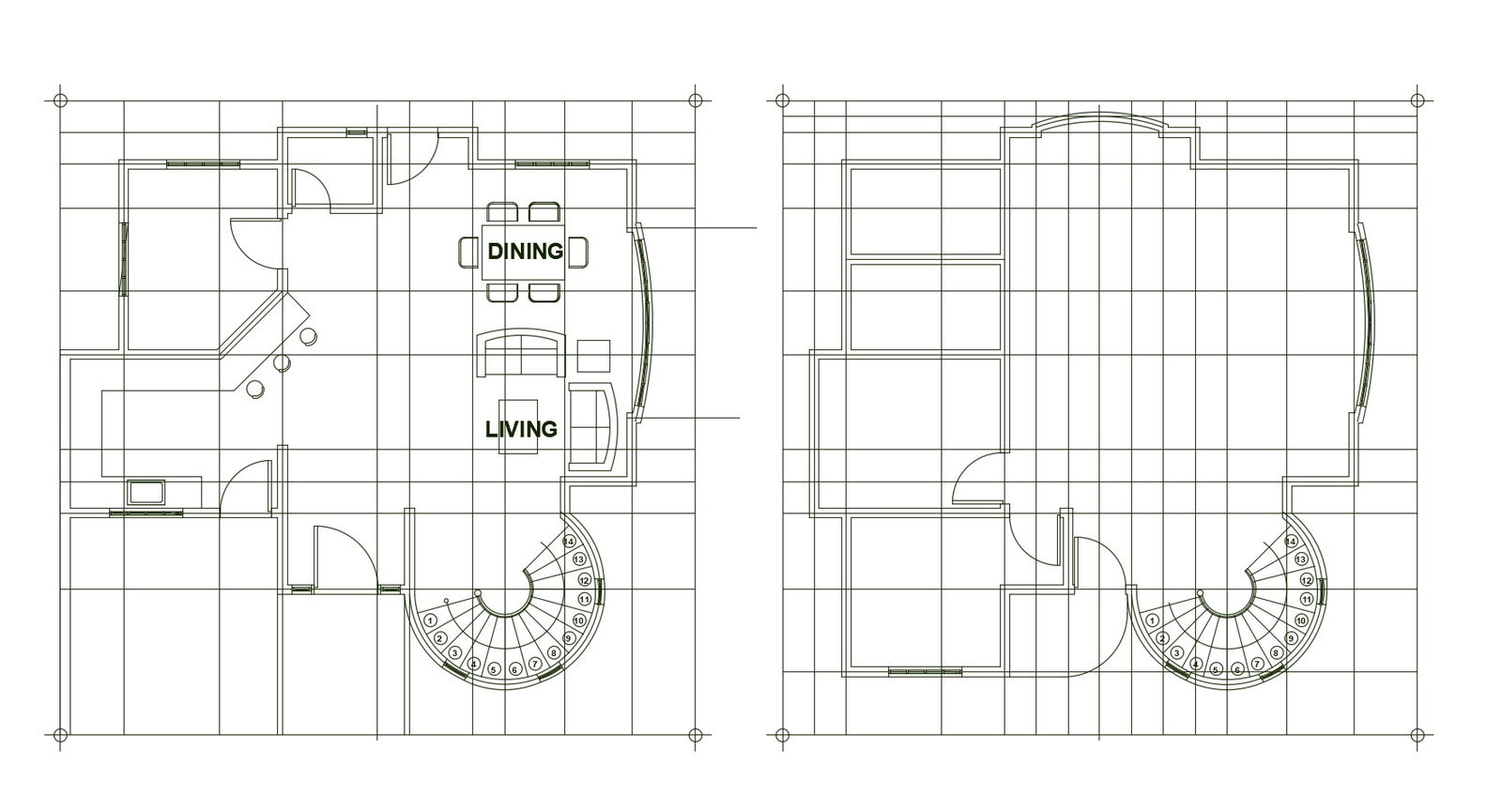 Home Floor Plan In DWG File which includes detail of the living room, dining room, bedroom, kitchen, staircase.