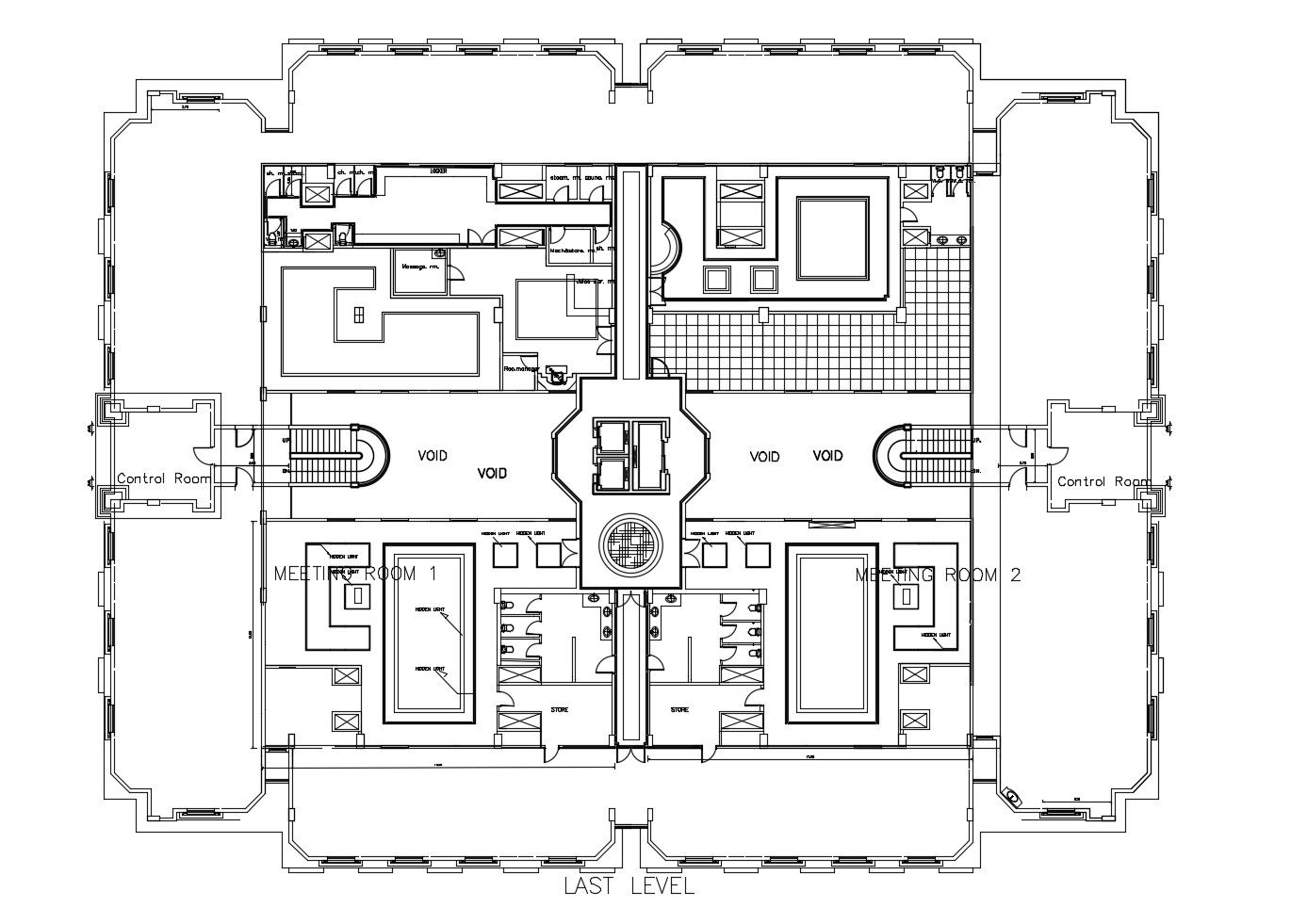 Office Building Plan In DWG File which provides detail of the meeting room, reception area, passage, store area, lobby, washroom, toilet, control room.