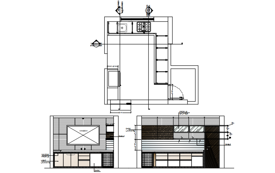 Kitchen Layout Plan In DWG File which includes detail of kitchen floor area, kitchen platform, section detail of furniture.