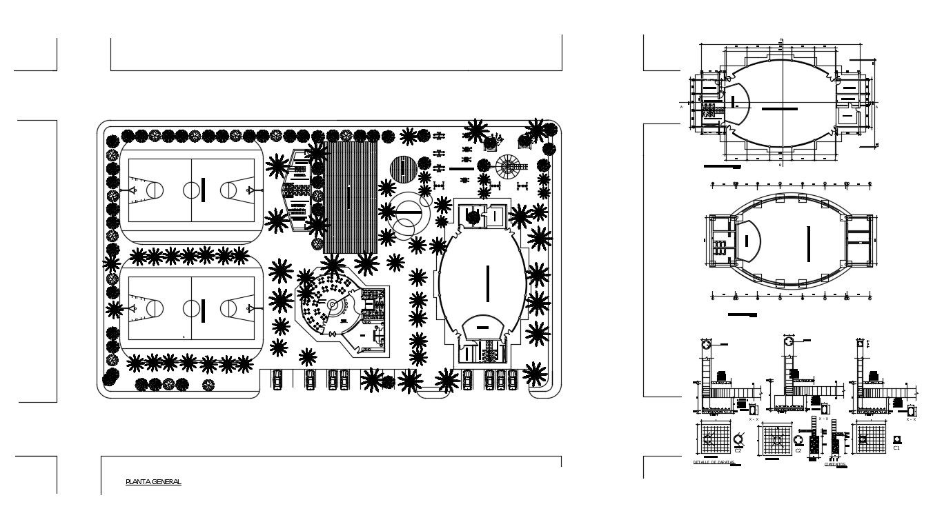Indoor sports complex design plan in AutoCad format that showing a top view of the sports ground, landscaping design, structure plan, car parking plan, washroom, toilet, etc.