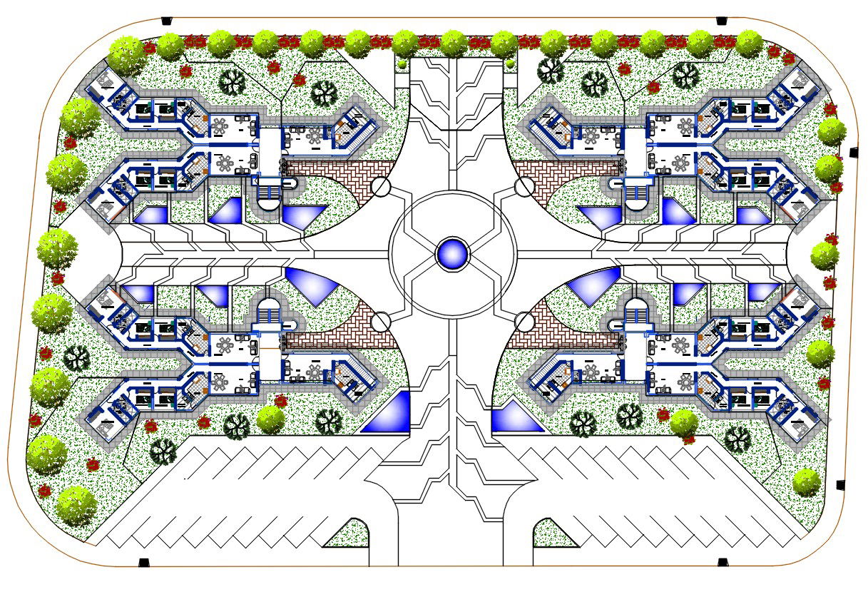 Residential Site Plan Drawing Plan in DWG file which includes details of apartment blocks with furniture detail and landscaping design in AutoCAD format.