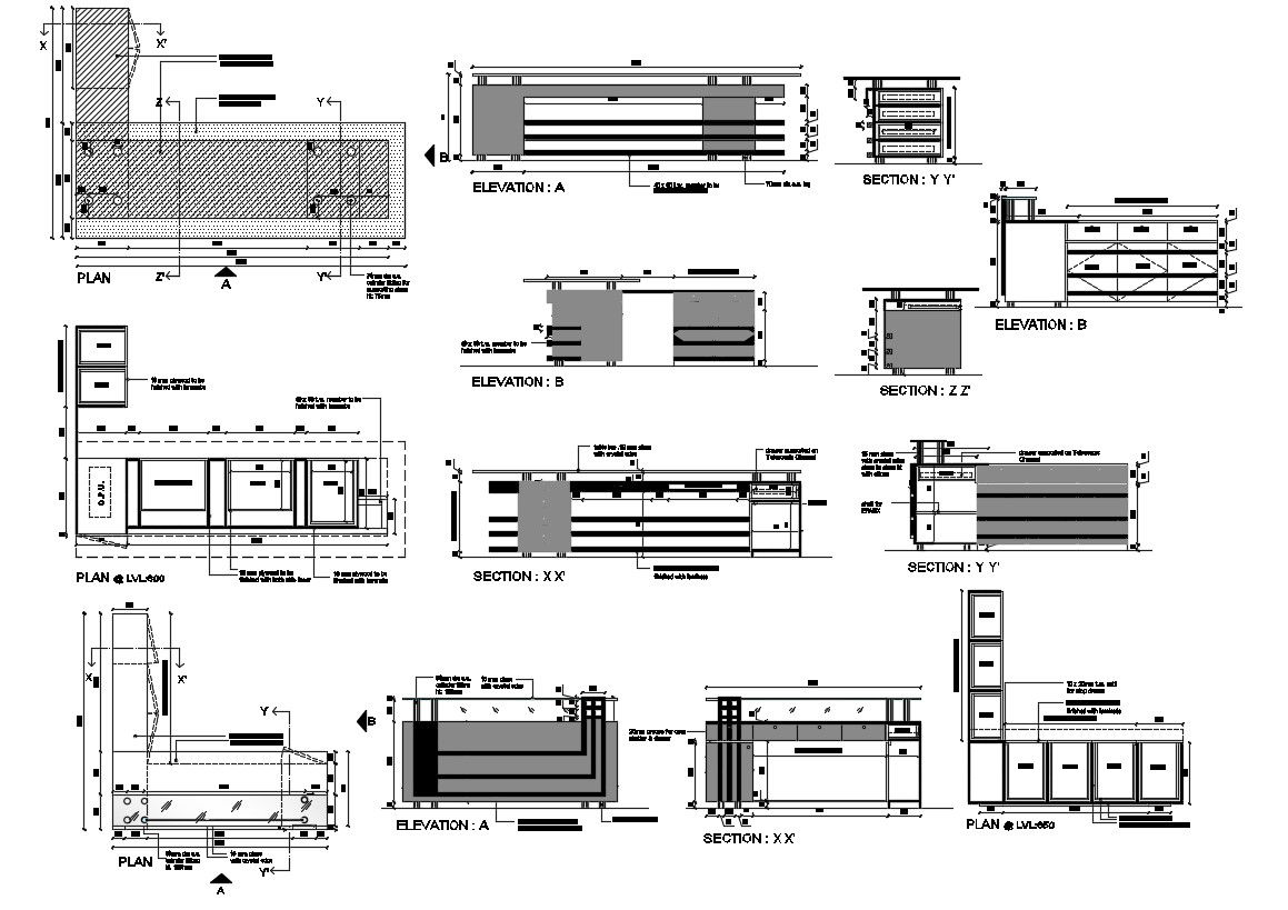 Office Desk Furniture DWG File; with dimension details which provides detail of table plan and section, and elevation design of office desk.