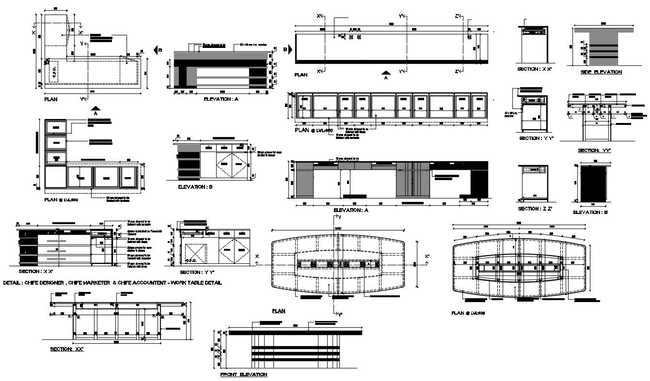 Autocad drawing of furniture design which includes a table plan with section view, front and side elevation of furniture.