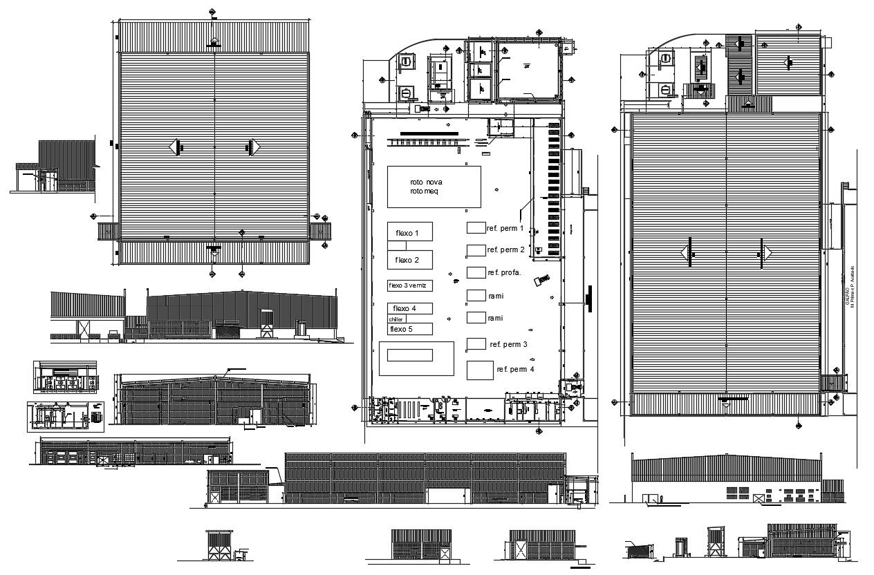 Building Construction Plan Cad File which provides details of different elevations, section plan and roof plan with all dimensioon detail.