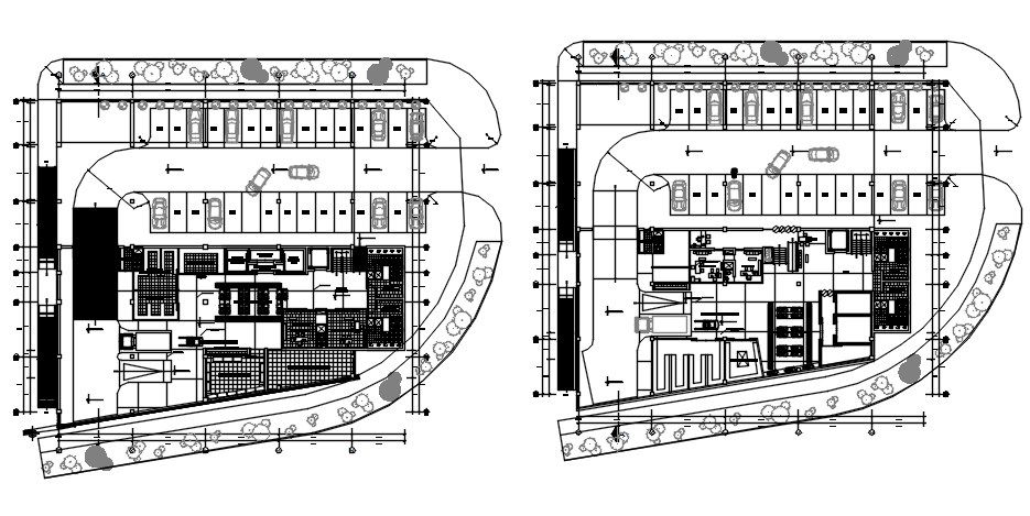 Autocad drawing of the shopping center with detail dimension which includes detail of different department, detail of parking area, lawn area, etc.