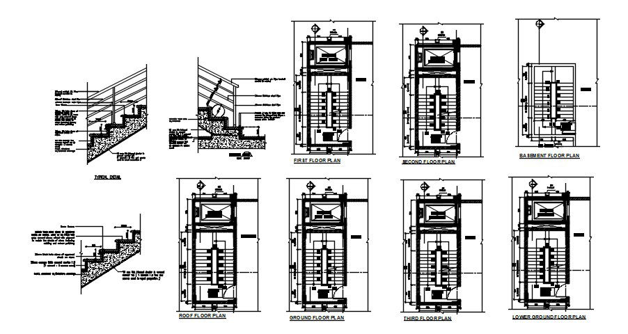 Staircase design with detail dimension in dwg file which includes detail of roof floor plan, ground floor plan, basement floor plan, lower ground floor plan, etc.