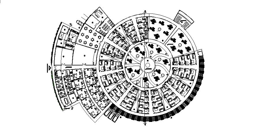 Architectural design of a hotel building in dwg file which provides detail of the restaurant area, office area, rooms, garden area, parking area, etc.