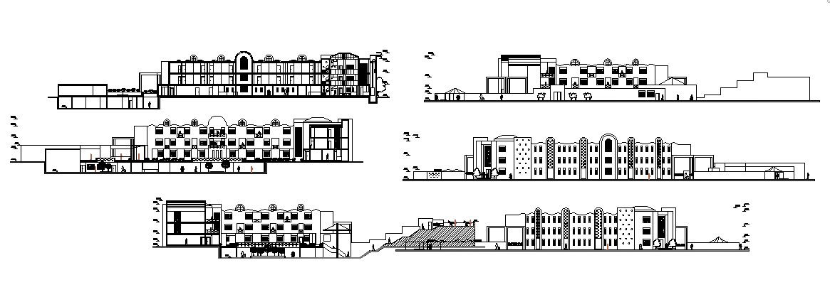 Resort building design with elevation details in AutoCAD which includes detail of front elevation, side elevation, back elevation, floor level, etc.