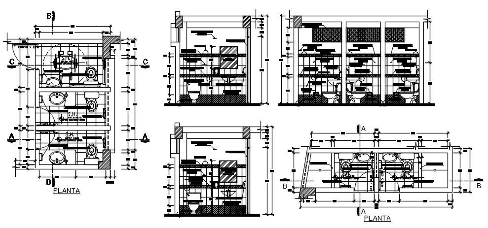 Autocad drawing of bathroom design which includes detail of different section drawing, detail of bathroom plan, detail of floor level, etc.