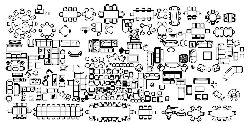 Design of furniture block in AutoCAD which includes detail of center table, sofa set, dining table, chair, etc.