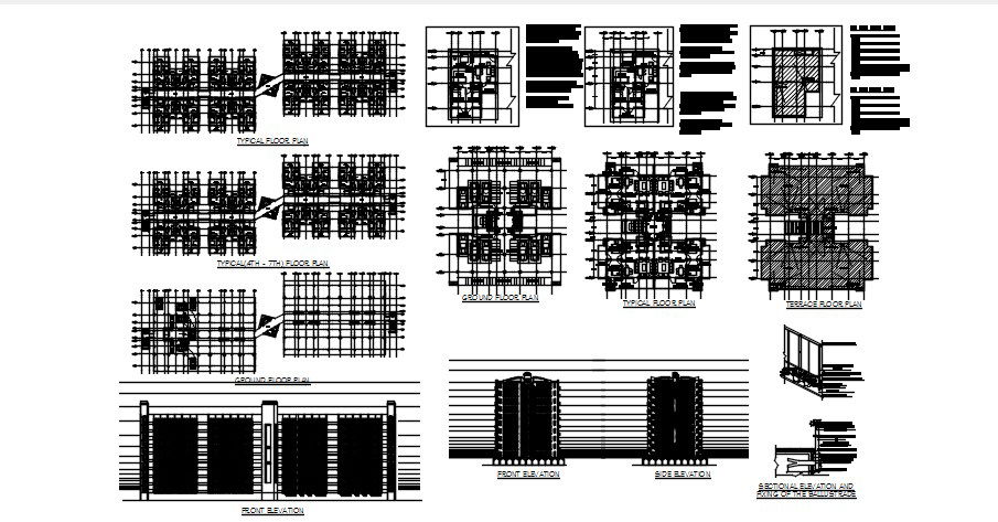 Building Floor Plan In DWG File which includes detail of front elevation, ground floor plan, detail of drawing room, bedroom, kitchen, dining room, bathroom, restroom.