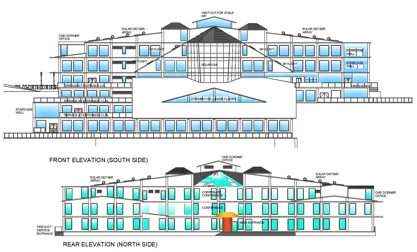 Drawing of building plan in AutoCAD which provides detail of front elevation, rear elevation, section detail of floor level, detail of entrance, detail of doors and windows, detail of outer design, etc.