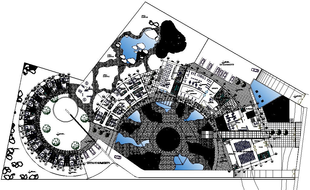 Ecotourism Architecture in AutoCAD with detail dimension which provides detail of different department in the center, detail of the garden area, detail of parking area, etc.
