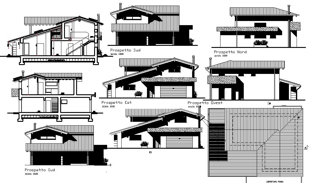 Design of bungalow with different elevation in autocad which provide detail of south elevation, north elevation, east elevation, west elevation, etc it also includes detail of roof plan.