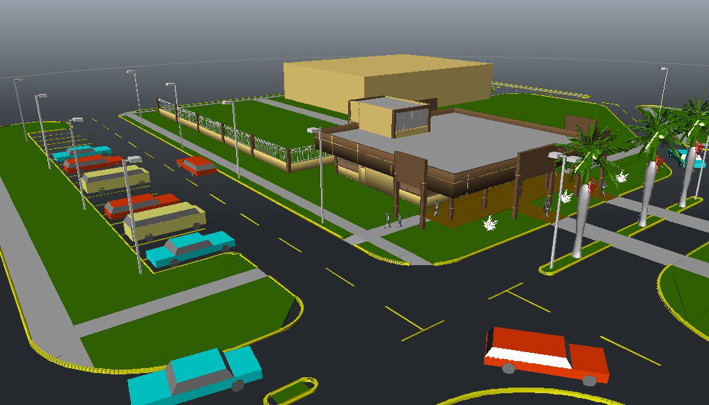 Shopping center 3d model in AutoCAD file which provides detail of shops, detail of the garden area, detail of roads, detail of parking area, etc.