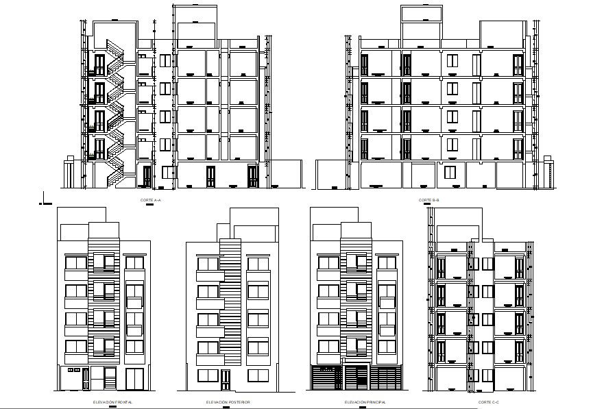 Residential apartment design plans in AutoCAD file which includes detail of front elevation, back elevation, detail of the different section, detail of floor level, etc.
