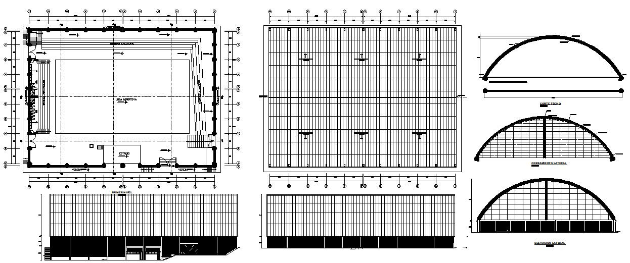 Building hall design in DWG file which includes detail of front elevation, back elevation, detail of the different section, detail of terrace plan, etc.