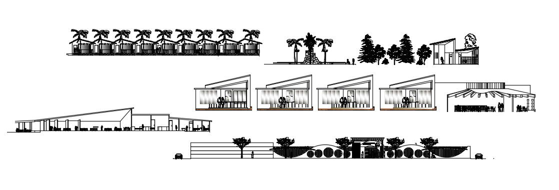 Recreation center design in AutoCAD file which includes detail of front elevation, detail of the different section, detail of floor level, etc.