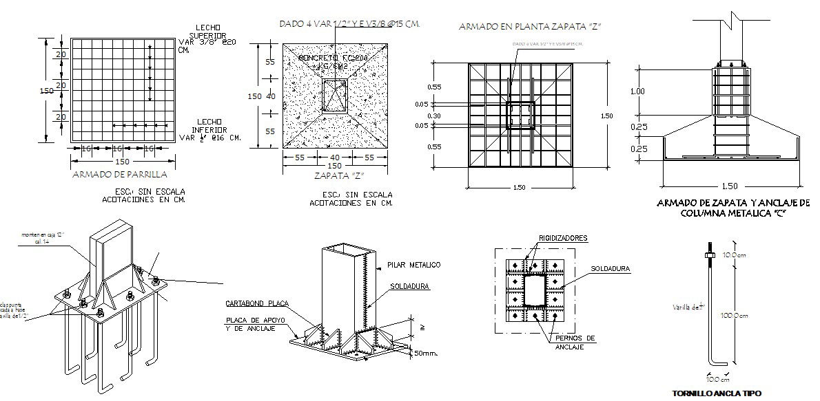 Foundation Structure Design In DWG File which includes detail of column footing, detail of bars.