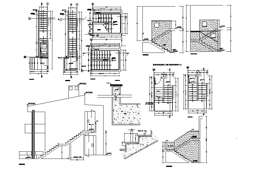 Staircase Drawing Detail In DWG File which includes detail of the different section, detail of floor level, detail of top view.