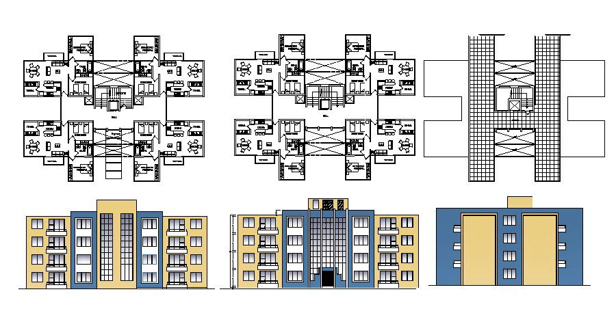 Apartment Elevation Drawings AutoCAD Drawings it includes ground floor plan, first-floor plan, front façade, side elevation, front elevation, it also includes a drawing room, master bedroom, kids bedroom, kitchen, dining room, toilets, bathroom, and balcony