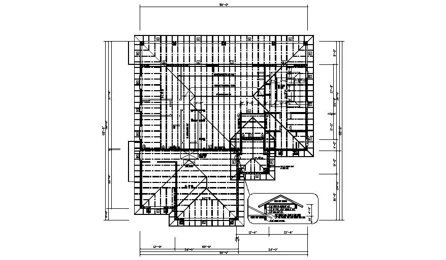 Drawing of roof plan 62 ft X 58 ft in AutoCAD it includes truss detail with each and every level