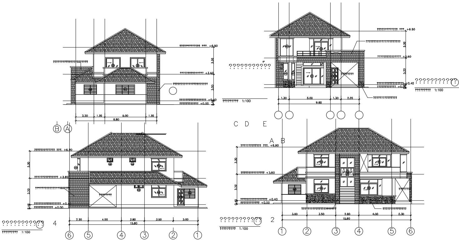 Two storey house design in AutoCAD file which provides detail of front elevation, side elevation, back elevation, etc it also gives detail of floor level.