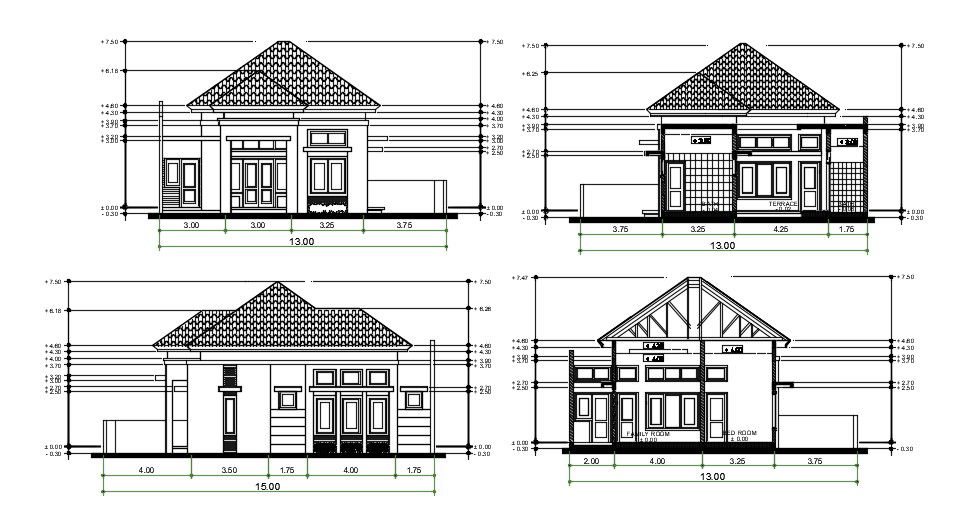 House elevation design in AutoCAD file which provides detail of front elevation, back elevation, detail of floor level, etc.