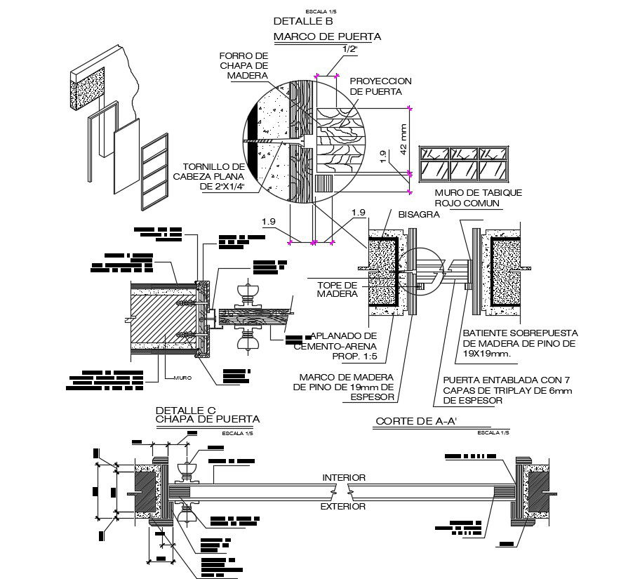 Door frame design with detail dimension in DWG file which includes the detailed dimension of door plate, wood veneer lining, door projection, etc.