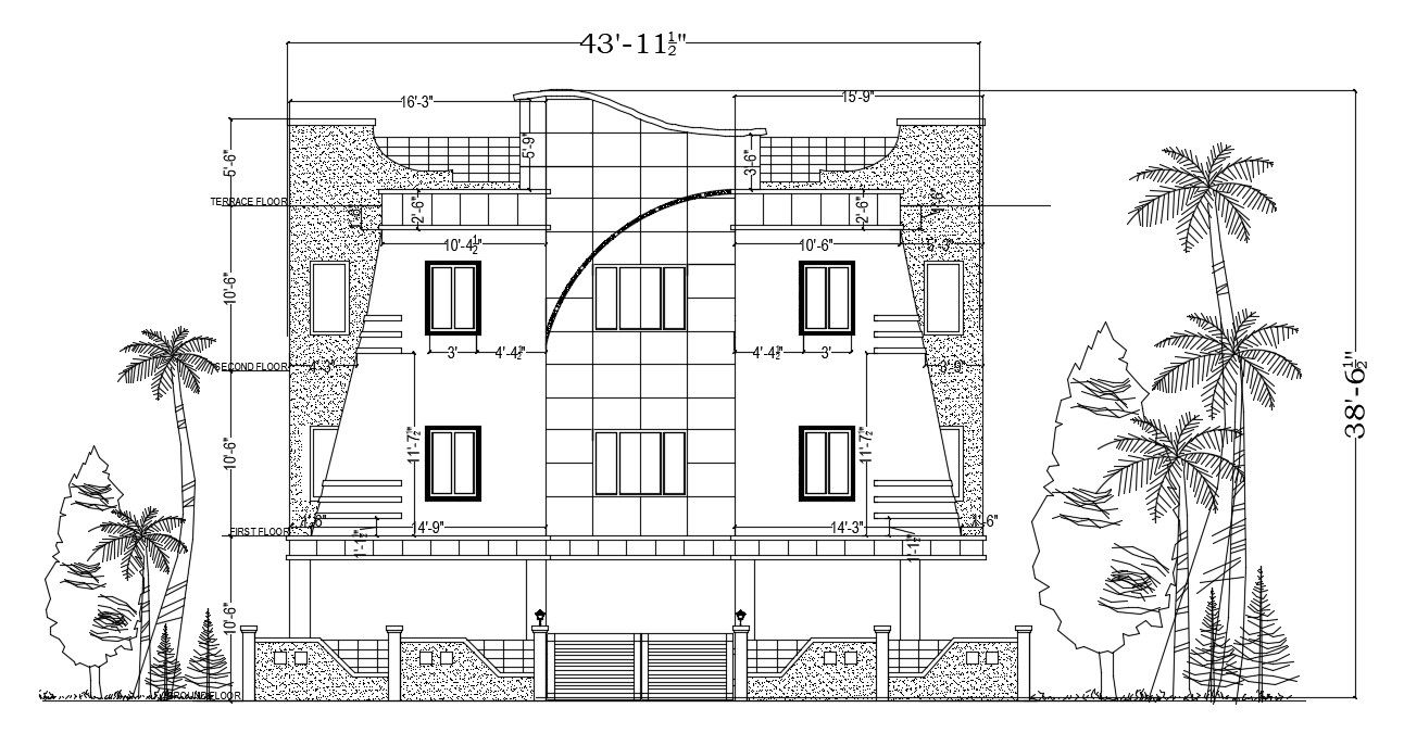 Elevation drawing of building in DWG file Which includes detail of front elevation details of floor level details of lawn area etc.
