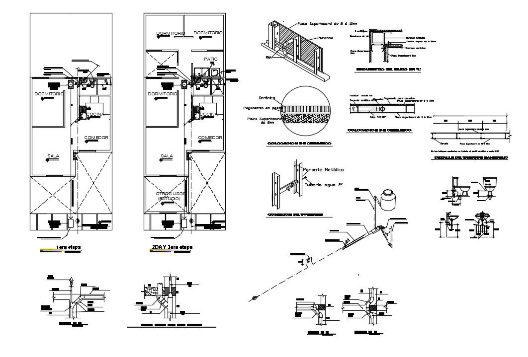 House plans in DWG file which includes details of the hall, kitchen, bedroom, dining room, washroom, etc and also provides details of washbasin and water closet.